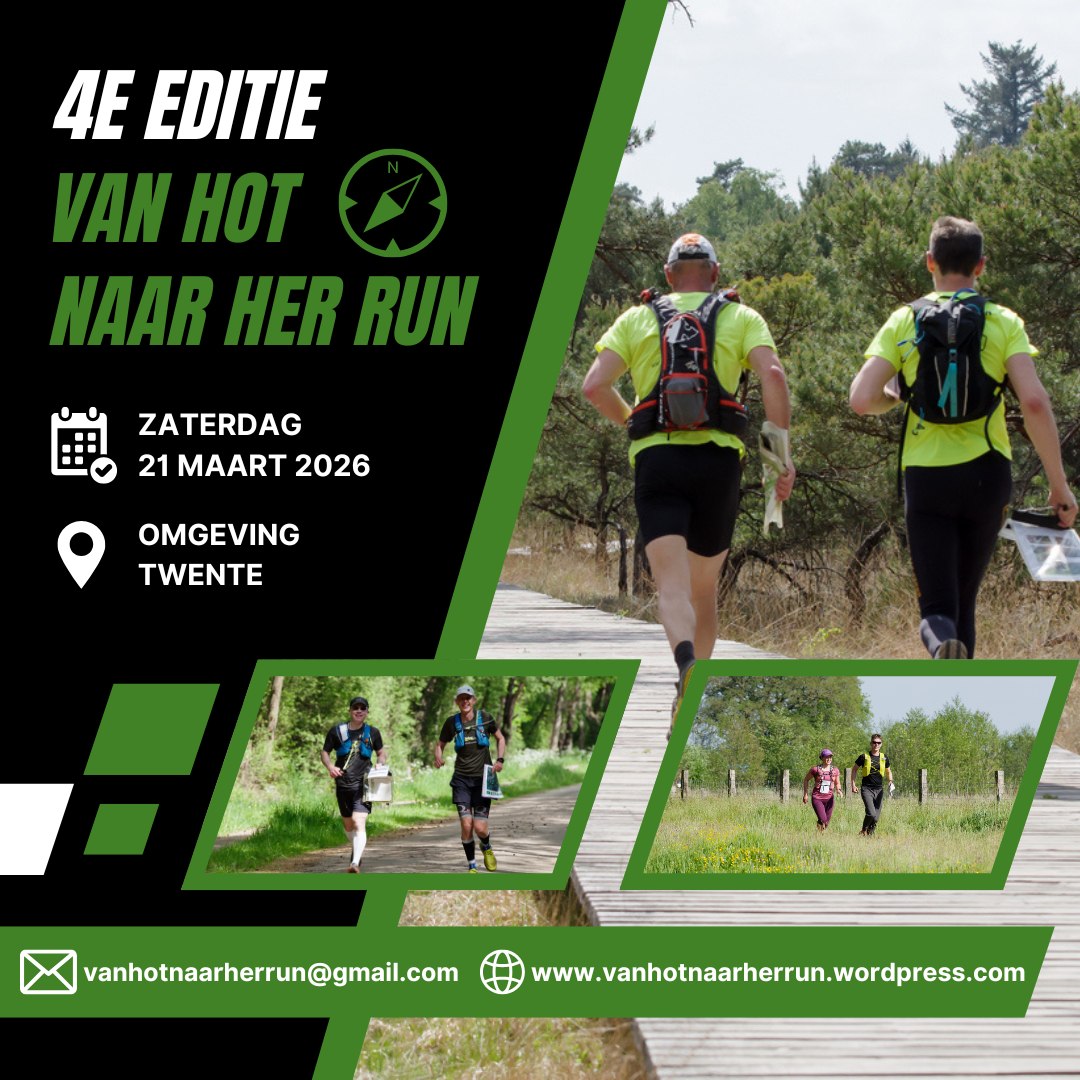 De Van Hot Naar Her Run is een XXL oriëntatierun in teams van 2 personen, dwars door het schitterende Twentse landschap. Deze vindt plaats op zaterdag 21 maart en heeft een duur van ca 8 uur.